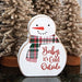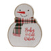 Baby It's Cold Outside Chunky Snowman Sitter is a wooden decor piece made with charming seasonal style. The sitter depicts a snowman wearing a red plaid scarf and friendly smiling face. Red text reads "baby, it's cold outside" in a mix of script and print. A lightly distressed finish adds a rustic farmhouse touch. The sitter is freestanding for stable display on a flat surface. Measures 5" high by 4" wide by .75" deep.