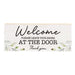 10" x 4" Leave Your Shoes Shelf Sitter is a wooden sign with a white print and unfinished sides. It comes with two keyhole slots for wall display, but it can also be displayed freestanding on shelves and tabletops. It reads, "welcome - please leave your shoes at the door - thank you" in black text with floral illustrations. Measures 4" high by 10" wide by .75" deep. Made in the USA.
