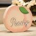 Peach Chunky Sitter is a wooden sitter with a peach design. Sitter reads, "peachy" in dimensional wood lettering and features a wooden leaf cut-out for detail. Sitter is freestanding for display on flat surfaces and measures 4.5" high by 5" wide by 1" deep.