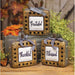 The Resin Harvest Basket Sitters are an assortment of three autumnal tabletop decorations featuring a brown woven basket design and faux metal edges. The top of each sign has a brown stem with a black and white checkered bow, modeling a pumpkin shape, and the center of each sign displays a white enamel square with black text, reading "Thankful", "Grateful", or "Blessed". These signs are perfect for Fall and Thanksgiving, displayed standing on a shelf, riser, counter, or other tabletop space. Each sign measures 6.5" high by 5.5" wide by 2" deep. Please note: This item features a variety of designs which are each sold individually (not as a set).