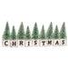 The Winter Sparkle Christmas Sitter is a decorative wooden block with a white finish and worn brown detailing. The block reads “Christmas” in raised wooden lettering. The block features a row of green bottlebrush trees, each with white flocking for a fresh snowfall effect. This sitter is perfect for a shelf or mantel during the holiday season, bringing a festive woodland touch to the home. Measures 4.5” high by 11.5” wide by 1” deep.