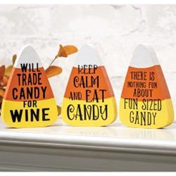 The Candy For Wine Sitters are an assortment of three decorative wooden blocks in the shape of candy corn silhouettes with an orange, yellow, and w...