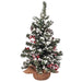 The Snowy Pine is a decorative tabletop tree with faux textured green pine needles and bits of thick white flocking for a fresh snowfall effect. The tree is dotted with bright red berries and pinecones, and the base is wrapped in a cut of rustic burlap fabric. This tree makes a beautiful accent in the home during the Winter and Christmas season, placed on a shelf or tabletop. Measures 18” high and 4” in diameter.