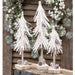 White Glittered Pinecone Tree 8" is a winter accent piece with white foam leaves that feature a glittered finish to give the appearance of fallen snow. Frosted pinecones on the tree and at the base highlight the snow-covered leaves. Tree has a 2" square wooden base with a glitter finish. Measures 8" high by 2" diameter overall.