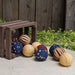 Americana Rag Balls are decorative balls with primitive patriotic style. Some balls are wrapped with strips of blue star-studded fabric, some are wrapped with red and off-white striped fabric, and some are wrapped with strips of off-white fabric. These decorative balls can be used as a vase or bowl filler or to accent patriotic tabletop decor. Package measures 6" high by 5" wide by 1.5" deep. Each ball measures 1.5" high by 1.5" in diameter.