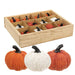 Resin Sweater Pumpkins are miniature pumpkin figures made from detailed carved resin with cozy fall-inspired design. Each pumpkin features a sweater knit texture and a flat bottom for freestanding display. The set includes four pumpkins each in shades of white, orange, and red. An included wooden crate with cardboard dividers can be used for storage or for organized display. The crate measures 8" high by 6" wide by 1.75" deep, and each pumpkin measures 2" high by 2" in diameter.