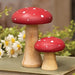 White Dotted Red Wooden Mushrooms bring a whimsical, nature-inspired touch to decorative displays. Carved from wood, the mushrooms each feature a natural stem with a contoured shape. A rounded cap tops each mushroom, painted red with white dots. The small mushroom measures 2.5” high by 2.5” in diameter, and the large mushroom measures 4.5” high by 3.5” wide.