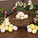 The Yellow & White Speckled Eggs serve as a floral accent, vase filler, or addition to springtime displays. The set includes 24 eggs in white and yellow hues along with a cluster of dried grass. Made from lightweight foam, the eggs offer endless decorative options. Each measures 1” high by .75” in diameter.  Nest not included.