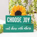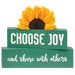 The set of three Choose Joy Sunflower Stackers are intended for stacked display to create a unique tabletop accent. Made from wood, the two bottom rectangle blocks have a teal green finish, and the cut-out sunflower topper has a realistic sunflower appearance. When displayed together they read, "Choose Joy and share with others," in a variety of white lettering. Measures 6.5" high by 7" wide by .75" deep overall.