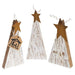 Distressed Rustic Wood White Christmas Trees have a wood-grain texture and they are topped by metal stars with coiled wires. One tree has a wooden tag with a nativity scene that reads, "Oh Holy Night." Measures 6.25" high by 3" wide by .75" deep (small); 9.5" high by 4.5" wide by .75" deep (medium); 11.5" high by 4.75" wide by .75" deep (large).