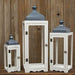 Metal Wood Lanterns is a set of three lanterns with tiered sizes. Lantern has an open-air wood frame with a distressed white finish and a metal top with a distressed gray finish. It has a finial and ring for possible hanging display and it is perfect for displaying flameless candles and greenery. Lanterns can be nested within each other for easy storing and they measure 30" high by 9.5" wide by 9.5" deep (large); 24" high by 8" wide by 8" deep (medium); 15" high by 5.5" wide by 5.5" deep (small).