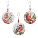 The Winter Bird Ornaments are a set of three round wooden cutout ornaments featuring a wintry floral theme with bird art. One ornament has pinecones, cotton, and greenery with a red bird and reads "peace" in red scripted lettering. Another ornament displays pine and holly greenery with shiny ornaments and a cardinal bird and reads "hope" in red scripted lettering. The third ornament is decorated with poinsettia, rose, and greenery art with a gold and blue bird, and reads "joy" in red scripted lettering. Each ornament includes a black wire hook with red beads, to use for hanging on a Christmas tree or wall, for a natural and whimsical touch to the home during Winter and Christmas. Each ornament measures 4" in diameter, or 7.5" high including hanger.