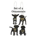 Dog Ornaments sell as a set of four wooden cutout ornaments. Each black dog ornament is painted with a paw print and a dog-related quote. Ornaments hang on a rusty wire loop. Measures 3½" high by 3" wide.