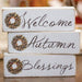 The Blessings, Autumn, Welcome Block is wooden freestanding block sign perfect for accenting an autumn floral or bookcase. Each block is off-white with distressed fininishing and features a graphic wreath and cursive text that reads,"Autumn," "Blessings," or "Welcome." Measures 4" wide by 1.25" by .75" deep. Please note: This item features an assortment of designs which are each sold individually (not as a set.)
