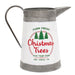 The Farm Fresh Christmas Trees Metal Pitcher completes festive farmhouse decor with vintage-inspired style. The pitcher features a galvanized metal finish with a white-painted body. A seasonal design on the pitcher depicts a trio of Christmas trees in a red circle with text that reads, "farm fresh Christmas trees, pick your own, pine, spruce, fir" in a mix of red and green. A flat base allows for stable display on a shelf or tabletop. Measures 12" high by 8.5" in diameter, and 13.75" wide with handle.