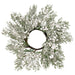 The Frosted Snow Berry Ring is a decorative floral candle ring with a dark brown twig-like base. The ring is filled with long pine needle greenery and mini white berries, all dusted with white flocking for a fresh snowfall effect. Pair this ring with a candle and display on a tabletop or shelf for a festive, frosty accent in the home during Winter and Christmas. Measures 2 in. in diameter (inner) and 7 in. in diameter (outer).