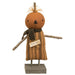 Gertrude Pumpkin Doll is a primitive plush doll set on a wooden base. Gertrude wears a striped dress, brown scarf, and wooden tag that reads, fall. The doll is finished with outstretched arms and hair made from wood. Measures 10 in. high by 8 in. wide by 2.75 in. deep.