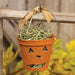 The Jack O Lantern Planter is a charming tabletop decor piece crafted with primitive fall style. The planter has a thicker cardboard feel with an imperfectly painted orange finish. A cutout jack o lantern face adorns the planter, allowing the dried prairie grass fill to peek through. A rusted wire handle tied with a beige burlap ribbon adds a rustic touch. Measures 3” high by 3.5” in diameter. Made in the USA!