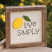 Live Simply Lemon Frame is a wooden box sign with a natural wood frame and sawtooth hanger. It has a creamy tan background flecked with black paint that reads, "Live Simply" in black lettering. Sign is accented with a layered wooden-cut out of a bright yellow lemon. Comes mounted in a brown wooden frame with a sawtooth hanger on the back and measures 6" square by 1" deep.