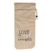 Love the Wine You're With Wine Bag is a wine bottle bag cover made of 100% cotton. Bag is beige-colored with drawstrings for opening and closing and it reads, "love the wine you're with" in black and white text. Wine bag is perfect for gifting with a bottle of wine or carrying a bottle into a party and it fits a standard size wine bottle. Measures 14" high by 6" wide.