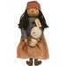 Maddie Doll is a primitive stuffed sitter with rustic seasonal style. The doll wears a gray knit sweater, red chevron hat, red striped skirt, and brown boots. She holds a primitive snowman friend wearing a red striped scarf. Suitable for display on a shelf, tabletop, or decorative chair, the doll features yarn hair, stitched facial features, and a brown paper name tag that reads, "Maddie." Measures 23" high by 8" wide by 4" deep.