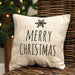 The Merry Christmas Snowflake Pillow is a decorative throw pillow made with a natural ivory linen-style fabric. The pillow reads "Merry Christmas" in modern black lettering and features a black snowflake graphic at the top. This pillow makes a chic and cozy accent for the home during the Christmas season, dressing up a chair or couch alongside a soft throw blanket. Measures 10" by 10".