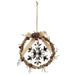 The Mini Wreath with Snowflake is a decorative twig vine wreath wrapped with greenery and red holly berries. The wreath has a burlap bow, pinecone detailing, and features a wooden snowflake ornament at the center, covered with a black and white buffalo check pattern. The top of the wreath includes a jute loop for a hanging display, perfect for bringing a rustic touch to a tree, door, or wall during the Winter and Christmas season. Measures 6.75” high.