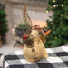 Mouse Winter Greenery Goody Sack is a small round plush covered in an antiquated ivory linen fabric. The mouse has a face made of black stitching and raffia whiskers, along with silver bell buttons and a striped hat. The mouse is decorated with a bundle of sticks and a small holly bough with pinecones and red berries. The mouse features a weighted bottom to ensure it sits securely on any shelf or tabletop. Measures 3.5" in diameter and 10" high.