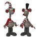The Plush Mice are an assortment of two (sold separately) plush standing mouse figurines made of soft gray felt fabric. One mouse wears a red and gray striped scarf and a black top hat, while the other wears a red and gray striped vest with a matching pointed hat and a red knit scarf. Both mice are detailed with fabric facial features and a set of wooden buttons. Display these mice standing on any shelf or tabletop space for a humorous and festive addition to Winter and Christmas home decor. Each mouse measures 14" high by 6" wide by 4" deep. Please note: This item features a variety of designs which are each sold individually (not as a set).