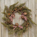 Our Rustic Holiday Pine has a pine look accented with assorted size berries, rusty bells, pine cones and torn fabric bows. Approximately 18" diameter from edge to edge.
