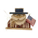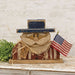 The Rustic Wood Red White and Blessed Uncle Sam is a unique decor piece crafted with patriotic style. Made from wood with chunky, layered design, the sitter depicts the famous face of Uncle Sam. The base layer shows Uncle Sam with a beige painted face, off-white beard, white brows, and black eyes. He wears a painted red and white striped shirt and a blue hat, and a layered off-white mustache adds dimension to his face. A weathered American flag is tied to Uncle Sam with jute rope, and dried straw is tied around his neck. A brown paper tag reading “red, white, and blessed” is attached with jute rope. A wood plank base allows for stable freestanding display. Measures 13” high by 16” wide by 2.25” deep. Made in the USA!