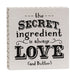 The Secret Ingredient Block is a decorative wooden block sign with a white painted finish and black polka-dot edges. The block reads “The secret ingredient is always love (and butter)” in a vintage black font. This block makes a humorous and heartwarming addition to a kitchen space year-round, displayed freestanding on a shelf or tabletop. Measures 6” by 6” and .75” deep.