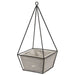 Wood Plant Holder with Triangle Metal Frame is a graywashed wood container with a plastic liner, sat inside of a 3D, triangular pyramid frame. The metal frame has a small hole at the top for hanging from a porch or ceiling hook. Take the liner out and display as a lantern with a battery operated candle, or fill with lush greenery for a unique planter. Measures 14.5" high by 6.5" square.