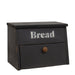 The Wooden 2 Compartment Bread Box is a well-crafted wooden box with 2 convenient compartments meant for holding bread and other baked goods. Painted in matte black with a distressed finish, the bread box features a natural wooden knob and painted text that reads, “bread.” The box features a front compartment and a top compartment, each with a hinged door. Measures 12” high by 16” wide by 9.75” deep.