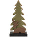 Wooden Pine Tree & Reindeer is a chunky wood decor piece made with festive rustic style. The piece depicts a reindeer wearing garland on its neck and sitting at the base of a pine tree. Painted in green, brown, and black, the figurine features a rustic distressed finish. A flat base allows for stable display on a shelf or tabletop. Measures 13" high by 6" wide by 3.5" deep.