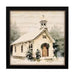 Woodland Christmas Church Framed Print is a framed art piece with charming seasonal design. The print depicts a church building decorated for Christmas and surrounded by snow and evergreen trees. A watercolor sheet music background provides a layered look. The print sits in a black and light wood frame. Print measures 8" high by 8" wide and frame measures 9" high by 9" wide by .5" deep. Made in the USA!
