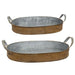 The Basket Weave Embossed Trays are a set of two decorative oval-shaped trays, made of metal with a golden-brown finish. The trays have rounded handles and a galvanized interior, and feature an embossed basket-weave pattern. These trays are wonderful for holding books, quote blocks, florals, or other functional or decorative household items. Large tray measures 4” high by 18” long by 11” wide. Small tray measures 3.5” high by 16” long by 10” wide.