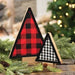 Buffalo Check Felt & Wood Trees are made of wood cut into triangle shapes with classic buffalo check print felt in red and white and black and white. The wooden tree parts are unpainted, and they have open backs for nesting; the smaller white and black tree nests into the larger red and black tree. The set of trees can be displayed freestanding on a shelf or mantel. Measures 8.75" high by 5" wide by 1.75" deep (large); 10.75" high by 8" wide by 1.75" deep (small).