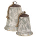 Distressed Graywashed Metal Bells are a set of 2 decorative bells with a rustic distressed finish. Each bell features a jute rope hanger for versatile display. The smaller bell measures 8” high by 6” in diameter and the larger bell measures 12” high by 9” in diameter.