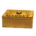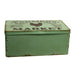 Distressed Metal Farmer’s Market Boxes offer versatile organization with rustic farmhouse style. The boxes each feature a rusted, weathered finish and coordinating lid. The lids each depict the silhouette of a hen with text that reads “farmer’s market, home grown fresh eggs” in a farmhouse style. One box features a matte mustard finish and one is finished in matte sage green. The small box measures 4” high by 9.5” wide by 5” deep, and the large box measures 4.5” high by 10” wide by 6” deep.