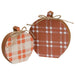 The Plaid Apple Sitters are a set of two decorative chunky wooden apple figurines with natural wood edges. The large apple has a red-brown finish with a white plaid pattern, the small apple has a cream finish with an orange plaid pattern, and both apples are accented with a jute bow. Display these apples freestanding, bringing a rustic touch to a tray, riser, table, or shelf during Fall. Large measures 4.5” high by 4” wide by .75” deep. Small measures 3.5” high by 3.25” wide by .75” deep.
