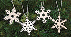 Snowflake Ornaments are made from laser-cut natural wood in four different styles. There are 6 of each style for a total of 24 ornaments. They are 2¼" in diameter and have a cotton cord string.