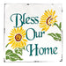 Bless Our Home Vintage Metal Wall Plaque is a sign made of painted white metal with distressed black trim and embossed sunflowers and text. It reads, "bless our home," in green lettering and boasts mild distress marks for an aged finish. It has two keyhole slots for hanging and looks darling above a mantelpiece or an entryway console. Measures 16.5" wide by 16.5" high.