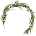 The Cape Daisy Garland is a decorative floral garland featuring a green-wrapped base. The garland displays varied textured greenery, stems of petite white astilbe buds, and soft cream Cape Daisy blooms. This garland is perfect for summer or year-round decor and can be displayed on a mantle, shelf, wrapped on a banister, or hung in a window frame or doorway. Measures 5 feet long.