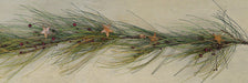 Country Needle Pine Garland features wispy long-needle pine branches on flexible, brown-wrapped wire stems, with burgundy berries, tiny pinecones, and rusty 1" stars. It is 4 ft. long.
