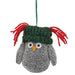 The Cozy Winter Owl Ornament is a decorative plush ornament made of soft gray fabric. The owl features stitched facial details and wears a knit green Winter hat with red tassels. The top of the ornament includes a green ribbon hanger, perfect for using to hang this owl from a Christmas tree, hook, knob, or other display during the holiday season. Measures 4.5" high by 4.25" wide by 2.25" deep.