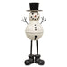 The Distressed Metal Standing Top Hat Snowman is a unique decorative accent for festive seasonal decor. Black metal boots with a wrinkled look form a sturdy base for the snowman, complete with a metal ring on the back for counterbalance. A white painted bell with a lightly distressed finish serves as the snowman’s body. His round head is painted white and adorned with a black smile and eyes and an orange wire carrot nose. Long black legs support the snowman, and his black metal arms mimic the look of twigs. The snowman wears a black top hat and trio of black buttons for a classic look. Measures 21” high by 6.5” in diameter.