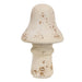 The Distressed White Metal Mushroom is crafted with an off-white finish featuring weathered details for a rustic look. An embossed stem with a flat base forms the foundation for the mushroom and is topped with a cap. The whimsical shape and textured finish of the cap add a unique touch to decorative displays. Measures 10.5” high by 6” in diameter.