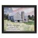 The Divine Purpose Framed Print is a decorative printed artwork piece made of lightweight wood inside of a wooden frame with a distressed black painted finish. The print depicts a country farm scene with a whitewashed barn, complete with a faded American flag design in the background and black scripted letters reading "God had a divine purpose in placing this land between two great oceans". Display this print during the patriotic season for a charming and festive addition to the home, placed standing on a shelf or tabletop. Measures 8" high by 10" wide. Made in the USA!