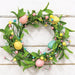 12" Easter Eggs Herb Leaves Wreath is an Easter-themed floral with pastel-colored eggs, seeds, and berries. Wreath has green fabric leaves and paper-wrapped branches on a flat, paper-wrapped wire base. Its green finish is accented by pink, blue, and yellow foam eggs, berries, and plastic seeds and its branches can be fanned out for a fuller look. Wreath looks great on a covered door, in an entryway, or on an empty stretch of wall and it measures a 6" inner diameter and a 13" outer diameter.